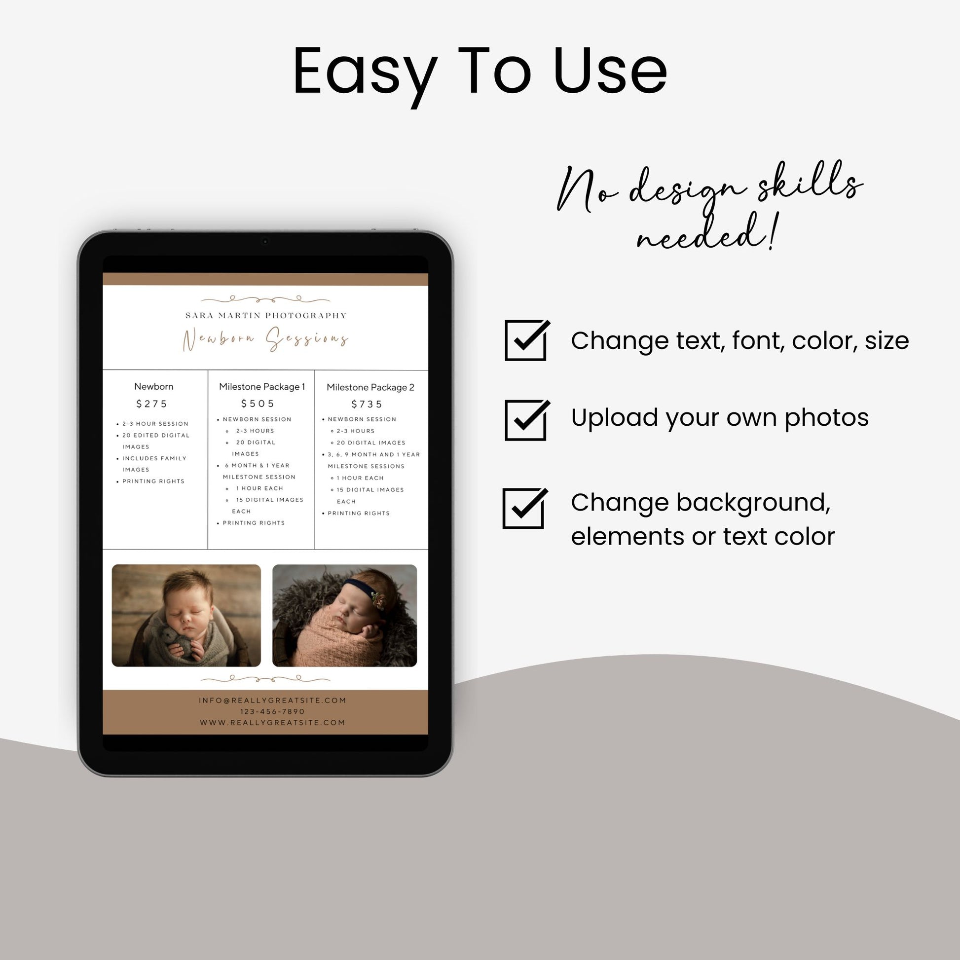 Whether you're a seasoned photographer or just starting out in newborn photography, our template provides a convenient and visually appealing way to communicate your offerings. Invest in this versatile tool today and elevate your photography business to new heights!