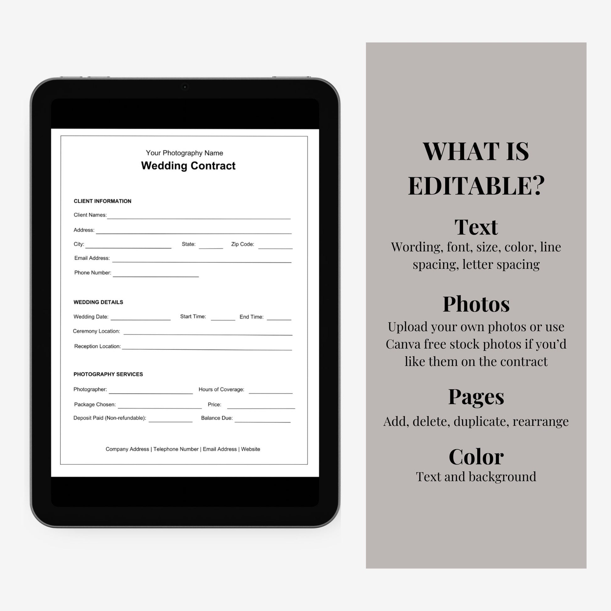 This template contains a wedding photography contract that you can use for your photography clients. This client contract can be edited in Canva so you can change or add to customize to your business needs.
