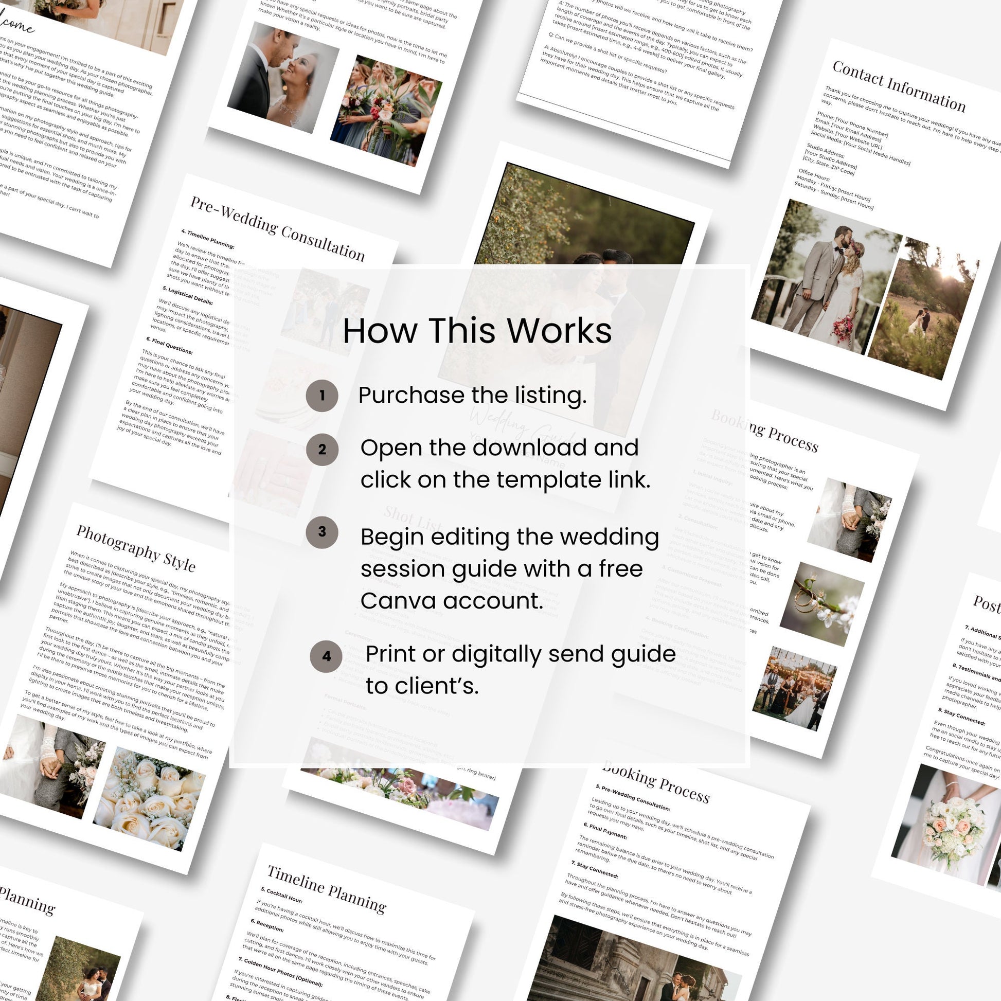 Inside this customizable template, you'll find everything you need to create a stunning wedding guide for your clients. From an introduction welcoming them to the process, to sections on photography style, timeline planning, shot lists, vendor recommendations, and more, this guide covers all the essential aspects of wedding photography.